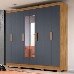 O modelo Ágata é um guarda roupa 8 portas com ampla repartição interna com cabideiros, gavetas e prateleiras espaçosas. Além disso, acrescenta um toque de elegância ao seu quarto, ao passo que também cria a ilusão de profundidade, graças ao espelho - acessório que não é apenas prático para verificar sua roupa antes de sair, mas também reflete a luz, iluminando seu quarto. Para completar, os pés mantêm a base do roupeiro longe da umidade do chão, proporcionando um móvel durável por muito mais tempo.