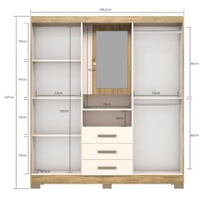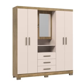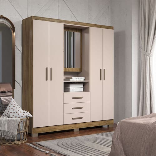 Guarda-Roupa Casal 4 Portas 3 Gavetas com Espelho e ideal para quem busca praticidade e organizacao aliadas a um design funcional. Possui quatro portas, tres gavetas com corredicas telescopicas e espelho com recuo, incluindo portas ocultas atras do espelho para armazenamento extra de objetos. Produzido inteiramente com chapa de 15 mm de MDP, oferece resistencia e durabilidade para uso diario.