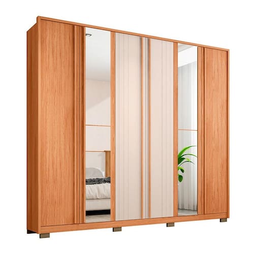 Que tal o Guarda-Roupa Mozart? Seu quarto de casal vai ficar ainda mais bonito e bem-organizado com o Guarda-Roupa Mozart te ajudando. Dispondo de 6 portas e 4 gavetas para receber seus itens de uso diário, ele também tem visual atemporal e neutro, destacando o amadeirado e o espelho, elementos que contribuem para uma decoração de encher os olhos. Por dentro, além de materiais de ótima resistência muito utilizados no mercado, o móvel tem gavetas com corrediças telescópicas, que abrem mais e com maior facilidade, permitindo que você tenha fácil acesso aos itens guardados nelas. Completo, né? Marca: Modern