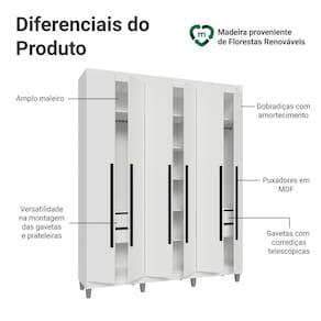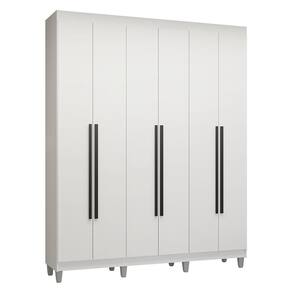 Com acabamento de alta resistência, o Guarda-Roupa Venus garante durabilidade por muito mais tempo. A estrutura branca e os puxadores em preto criam um visual sofisticado, que se adapta a qualquer estilo de decoração. Os puxadores de 80 cm, fabricados em MDF, são um dos grandes diferenciais, trazendo um design alongado e moderno. Os pés elevam o móvel, conferindo elegância e facilitando a limpeza do ambiente.