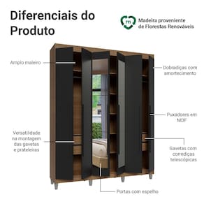 O Guarda-Roupa Saturno oferece versatilidade para organizar seu espaço da melhor forma. Com dobradiças com amortecimento, as portas fecham suavemente. As gavetas permitem abertura total, enquanto o amplo maleiro é perfeito para itens maiores. Além disso, você pode ajustar as gavetas e prateleiras para personalizar o interior conforme suas necessidades. As portas do meio possuem espelho, agregando ainda mais funcionalidade e sofisticação ao móvel.