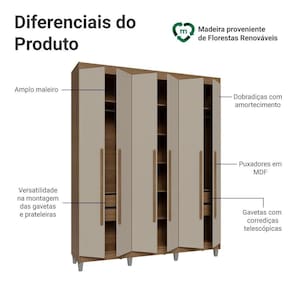 Oferece amplo espaço para organizar suas roupas e acessórios com facilidade. Suas portas, equipadas com dobradiças com amortecimento, fecham suavemente, garantindo conforto e durabilidade. As gavetas permitem abertura total, e o amplo maleiro é ideal para itens maiores. Você também pode ajustar as gavetas e prateleiras para personalizar o interior conforme suas necessidades.