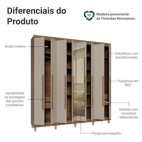 Suas portas possuem dobradiças com amortecimento, fechando suavemente, enquanto as gavetas possuem corrediças que permitem abertura total. O maleiro espaçoso é ideal para itens maiores, e você pode ajustar gavetas e prateleiras para personalizar o interior conforme suas necessidades. As duas portas centrais com espelhos trazem ainda mais praticidade e sofisticação ao móvel.