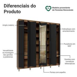 Com amplo espaço para organizar roupas, calçados e acessórios, ele conta com portas de fechamento suave graças às dobradiças com amortecimento. As gavetas possuem corrediças que permitem abertura total, e o maleiro espaçoso é ideal para itens maiores. Você ainda pode ajustar gavetas e prateleiras para personalizar o interior conforme suas necessidades. O espelho nas portas centrais valoriza o ambiente, ampliando a sensação de espaço.