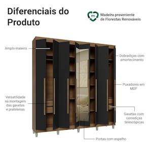 Com amplo espaço para organizar roupas, calçados e acessórios, ele conta com portas de fechamento suave graças às dobradiças com amortecimento. As gavetas possuem corrediças que permitem abertura total, e o maleiro espaçoso é ideal para itens maiores. Você ainda pode ajustar gavetas e prateleiras para personalizar o interior conforme suas necessidades. As portas do meio possuem espelho, agregando ainda mais sofisticação e praticidade ao móvel.
