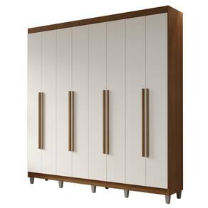 A estrutura e os puxadores em tom Rustic, combinados com portas Brancas, criam um visual elegante e moderno. Os puxadores de 80 cm em MDF destacam o design alongado do guarda-roupa, enquanto os pés elevam o móvel, facilitando a limpeza e valorizando o ambiente.