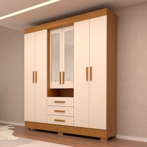 O(a) Guarda-Roupa Casal Débora Capelinha 6 Portas 3 Gavetas com Espelho 100% Mdf Cinamomo/Off White - Acp Móveis é produzido em 100% MDF na escala de brilho Brilhante e Semi-Brilho, e possui um grau de dificuldade de montagem: Difícil.