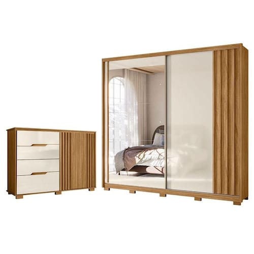 Começou a procurar móveis para seu quarto? Então apresentamos para você este belo conjunto composto pelo guarda roupa da linha Dhara e a cômoda da linha Texas. O guarda roupa possui duas portas deslizantes, proporcionando uma otimização de espaço. Seu destaque é o espelho em uma das portas. Internamente conta com três gavetas. Complementando o conjunto, a cômoda possui duas portas e quatro gavetas, perfeito para organizar suas roupas e acessórios. Assim como no guarda roupa, a cômoda possui detalhes ripados, corrediças telescópicas e pés em PVC. Fabricados pela Moval, são desenvolvidos em MDP de alta qualidade, sendo perfeito para quem busca praticidade e sofisticação para compor o quarto do casal, aproveitem!