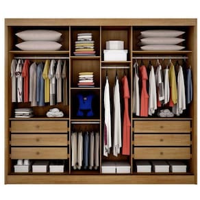 - Produzido em mdf. Esse material é durável contra a ação do tempo e firme contra a envergadura por peso; - Corrediças telescópicas nas gavetas que permitem um deslize amplo e suave no movimento de puxar; - Possui cabideiro e calceiro em alumínio, e o trilho inferior possui roldanas para rolamento; - Espaço reservado para roupas longas; - Prateleiras espaçosas para organização de camisas, calças, acessórios e até o jogo de cama; - 8 Gavetas; - 8 Prateleiras; - 4 Cabideiros; - Necessário Montagem: Sim.
