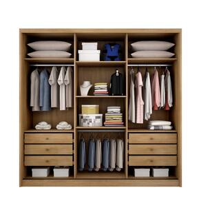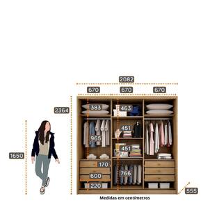 O Guarda Roupa Casal em MDF com Espelho 3 Portas de Correr Medelim Novo Horizonte combina altura, boa profundidade e excelente divisão interna. Fabricado 100 em MDF de 25mm, possui 3 portas de correr com trilho inferior em alumínio e roldanas com amortecedores, além de roldanas superiores com guia zero e freio para maior estabilidade. Conta com 6 gavetas com corrediças telescópicas, 5 prateleiras, cabideiro e calceiro em alumínio. O perfil puxador e o batente alinhador em alumínio bronze conferem um toque de modernidade e resistência.