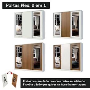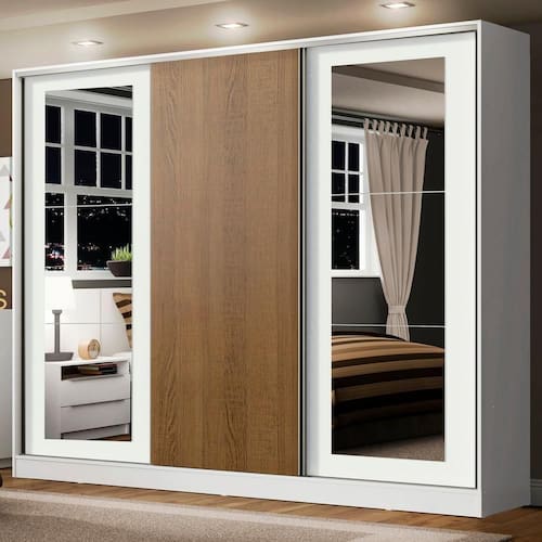 - Itens inclusos: Três cabideiros, quatro gavetas internas, oito prateleiras, três portas de correr, sendo uma de madeira e duas com espelhos, todas apresentando sistema anti-descarrilhamento e puxadores em alumínio em toda a extensão;