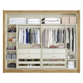 Particularidades do guarda-roupa: Características: - Fabricado em 100% MDF - Amplo espeço interno - Roldanas com sistema de amortecimento e regulagem - Gavetas espaçosas com puxadores em poliestireno na cor champagne - Gavetas com corrediças telescópicas - Modulação interna versátil que permite acomodar vestidos longos - Portas com design minimalista - Compartimento específico para acomodar sapatos - Costas parafusadas - Puxadores em MDF embutidos nas portas - Profundidade ideal para acomodar cabides - Cabideiros resistentes em alumínio