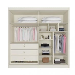 O Roupeiro Nantes une comodidade, espaço e beleza em um só produto. Produzido em mdf, possui 4 portas de bater e 3 gavetas com corrediças telescópicas e uma linda e pratica sapateira com corrediça telescópica; costas parafusadas que aumenta a resistência do móvel. Este produto conta ainda com prateleiras espaçosas e colmeia e puxadores em madeira.Características: 4 Portas 3 Gavetas, sendo 1 com chave Estrutura em mdf Corrediças telescópicas Prateleira Acabamento em verniz uv Cabideiros de alumínio Puxadores externos em madeira EspelhoDimensões: Altura: 237 cm Largura: 169 cm Profundidade: 56 cm Peso: 166,00 kgGarantia do fornecedor de 3 meses