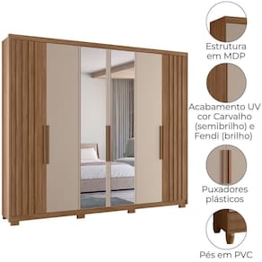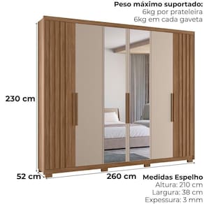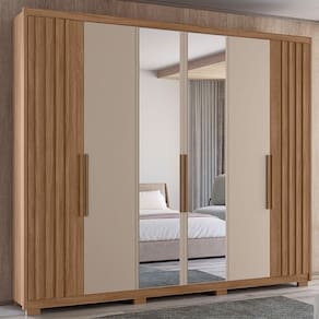 Desenvolvido para facilitar sua rotina, o Guarda-Roupa Casal Araguaia traz design funcional e amplo espaço interno. Estrutura em MDP (15/12 mm) e acabamento em pintura UV. Composto por portas com dobradiças metálicas e tripla opção de montagem (permitindo escolher a posição das portas com ripados em MDF e com espelho, seja na lateral ou ao centro), prateleiras internas, cabideiro interno (alumínio) e gavetas com corrediças telescópicas. Produto com dupla opção de montagem: pés em PVC ou sapatas plásticas (2 mm), conforme preferência do cliente. Este produto será entregue em 05 volumes.