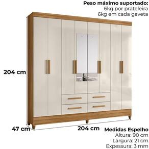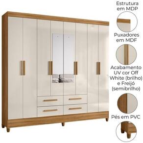Desenvolvido para facilitar sua rotina, o Guarda-Roupa Casal Flórida traz design funcional e amplo espaço interno. Estrutura em MDP (15/12 mm) e acabamento em pintura UV. Composto por portas com dobradiças metálicas (centrais com espelho), prateleiras internas, cabideiro interno (alumínio) e gavetas com corrediças telescópicas. Produto com dupla opção de montagem: pés em PVC ou sapatas plásticas (2 mm), conforme preferência do cliente. Este produto será entregue em 04 volumes.