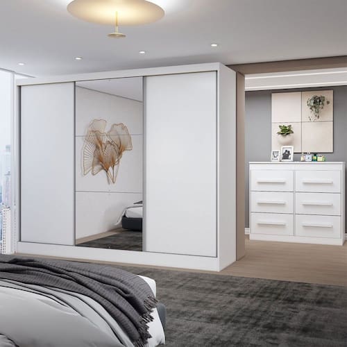 O(a) Guarda-Roupa Casal Europa 3 Portas 10 Gavetas 100% Mdf com Espelho Branco - Loja é produzido em MDF na escala de brilho Semi-Brilho, e possui um grau de dificuldade de montagem: Médio.