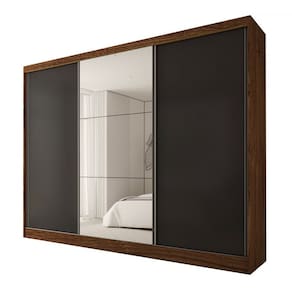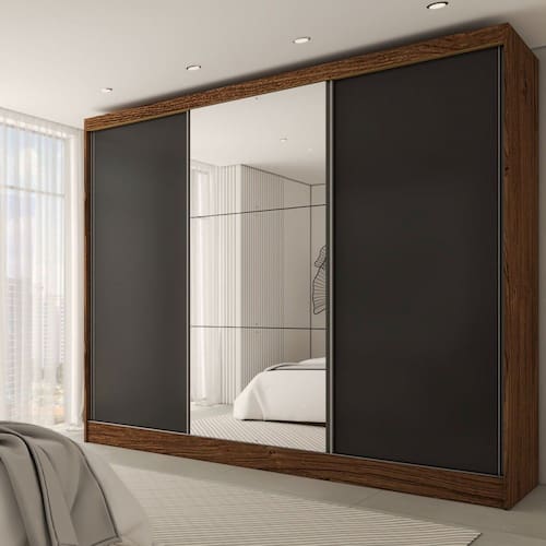 O(a) Guarda-Roupa Casal Europa 3 Portas 4 Gavetas 100% Mdf com Espelho Castanho/Preto - Loja é produzido em MDF na escala de brilho Semi-Brilho, e possui um grau de dificuldade de montagem: Médio.