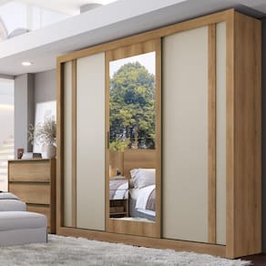 Caracteristicas: Corpo e portas em MDP de 15mm Fundos do roupeiro e das gavetas em MDF de 3mm 3 Portas de correr Espelho 2 Prateleiras removiveis 4 Tampos fixos 4 Gavetas 2 Puxadores em MDF 1 Puxador em aluminio 10 sapatas deslizantes em PVC Sistema de correr com rolamento e trava 2 Cabides em aluminio Sistema de montagem com parafusos e Minifix