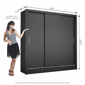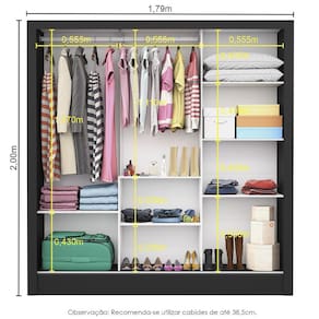 Guarda-Roupa Fortaleza, combinação perfeita entre conforto e conveniência para o quarto. O Guarda-Roupa Fortaleza com 3 portas de correr, 2,00m de altura, 1,79m de largura e 0,47m de profundidade combinado com 6 prateleiras e um amplo cabideiro, possui soluções inovadoras Para atender as mais exigentes necessidades. Cabideiros com 1,11m com suporte no centro. Não enverga com peso dos moletons, ternos, sobretudos, camisas e acessórios. Prateleiras ideais para colocar roupas de banho, perfumes, kits de maquiagem, caixinhas com acessórios e bolsas menores, e ainda com divisão ele/ela, proporcionando ao casal acomodar todas as roupas e acessórios de forma mais organizada e com maior visibilidade. Sapateiras com espaço ideal para guardar desde mala de viagem até coleções de tênis, sapatos, ou outros acessórios.