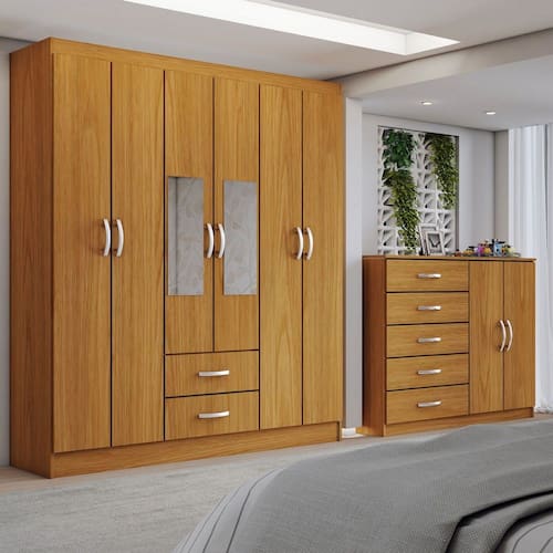 O(a) Guarda-Roupa Casal Gavin 6 Portas 2 Gavetas e Espelho com Cômoda 2 Portas 5 Gavetas Cinamomo - Loja é produzido em MDP na escala de brilho Brilhante, e possui um grau de dificuldade de montagem: Médio.
