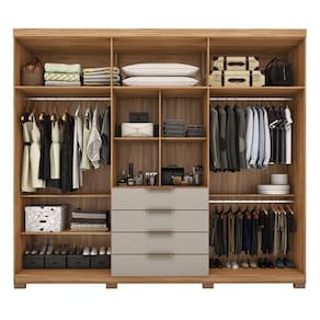 O Guarda-Roupa Casal Giardino une estilo e conexão com a natureza. Suas cores e texturas criam um ambiente calmo, enquanto os puxadores em ABS na cor ouro com detalhes curvos trazem aconchego. As portas centrais espelhadas oferecem praticidade e elegância. Com excelente distribuição interna, possui cabideiros metálicos para roupas, prateleiras para acessórios e sapatos, maleiro espaçoso e gavetas externas para itens pessoais. Com amplo espaço, é ideal para organizar os pertences do casal de forma funcional, deixando o quarto mais bonito e confortável.