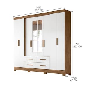 Espaçoso e com linhas retas que trazem modernidade, o guarda roupa San Lorenzo é feito em MDP de alta qualidade. Conta com 8 portas de bater com 2 espelhos nas portas centrais e 4 gavetas externas com corrediças telescópicas que conferem uma abertura ampla e fechamento suave. Com puxadores em MDF, dobradiças metálicas e cabideiros em alumínio, ele confere resistência e durabilidade em seus componentes. As portas centrais recuadas conferem um design moderno e sofisticado.