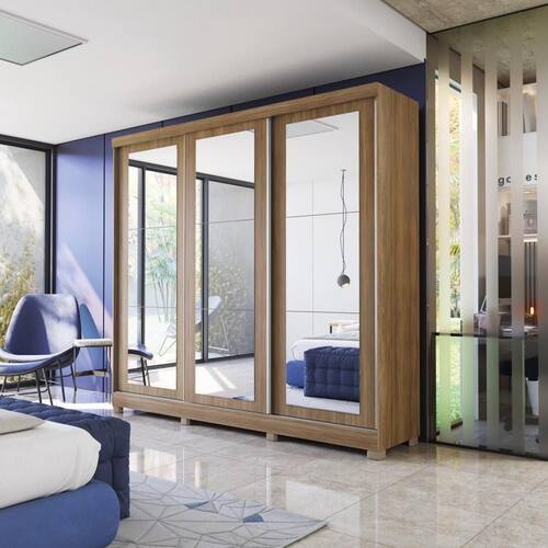 Na cor Nogueira, com 3 portas de correr e 8 gavetas, espelho em todas as portas e pés em polipropileno, ele tem o tamanho ideal para um quarto de casal. Todo produzido com chapas de 15mm, o que garante mais robustez, firmeza e qualidade ao seu guarda-roupas.