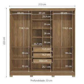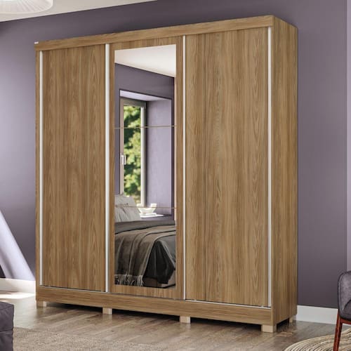 Produzido em MDP, material de alta qualidade, com chapa de 15mm, ele conta com três portas de correr e o tamanho ideal para todos os ambientes, com 2,23m de altura, 2,13m de largura e 53cm de profundidade. E são sete camadas de pintura, tanto na parte interna quanto na externa, o que garante mais durabilidade e beleza ao seu móvel.