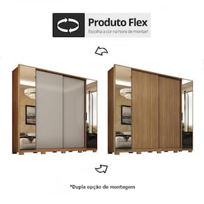ESPECIFICAÇÕES: Estrutura em MDP Pintura UV 2 Portas deslizantes Trilho superior de plástico Trilho duplo inferior de alumínio 2 Portas de giro com puxadores metálicos Dobradiças metálicas Portas laterais com espelho 4 Gavetas internas Corrediças telescópicas Puxadores metálicos nas gavetas Maleiro 3 Cabideiros Amplos compartimentos internos Montagem flex Pés em PVC