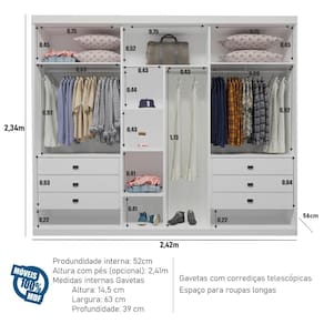 Medidas:Altura: 2,34 m (sem pés) e 2,41 m (com pés) / Largura: 2,42 m / Profundidade Externa: 56 cm / Profundidade Interna: 39 cm