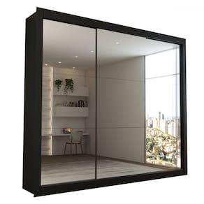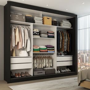 O(a) Guarda-Roupa Casal Luiza 3 Portas de Correr 4 Gavetas Espelhado Preto - Loja é produzido em MDP na escala de brilho Brilho, e possui um grau de dificuldade de montagem: Médio.