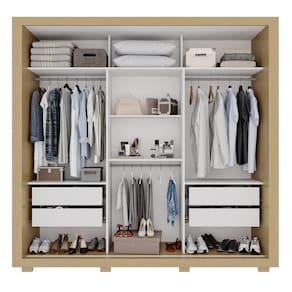 Seu interior clean na cor branca valoriza a visualização das roupas e conta com divisões amplas e funcionais, além de sapateira embutida, que ajuda a manter tudo organizado.