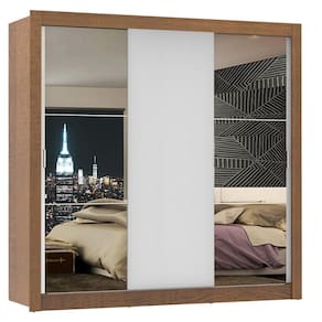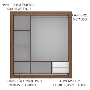 - Itens inclusos: Três (3) prateleiras totalizando cinco (5) nichos | Duas (2) gavetas internas brancas | Um (1) cabideiro grande | Três (3) portas de correr sendo uma (1) de madeira e duas (2) com espelhos e puxadores em PVC