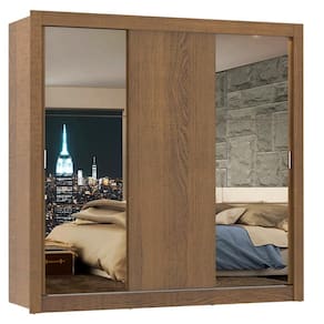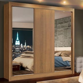 - Itens inclusos: Três (3) prateleiras totalizando cinco (5) nichos | Duas (2) gavetas internas brancas | Um (1) cabideiro grande | Três (3) portas de correr sendo uma (1) de madeira e duas (2) com espelhos e puxadores em PVC | Um (1) Kit com oito (8) pés em PVC