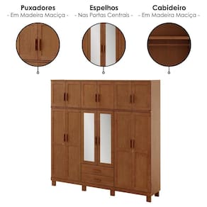 Guarda Roupa Casal 1292C, inspiração rústica que eleva a personalidade do seu quarto! Conta com estrutura em Madeira Maciça Taeda com espessuras de 12/14/16 mm (travessa frontal 25 mm e fundo de 2,5 mm), acabamento em pintura brilho 10%. Composto por Maleiro superior equipado com portas com detalhes emoldurados, dobradiças metálicas e puxadores em madeira maciça, assim como nas portas inferiores, sendo 3 delas com fechamento por chave e as 2 centrais com espelhos de 3 mm. Acompanha também amplas prateleiras internas (MDF 12 mm), cabideiro em madeira maciça, gavetas externas com corrediças telescópicas e pés retos reforçados, também em Madeira Maciça de 40 mm. Produto será entregue em 03 volumes.