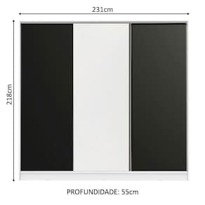 Medidas totais do armário: 218 cm de altura x 231 cm de largura x 55 cm de profundidade.