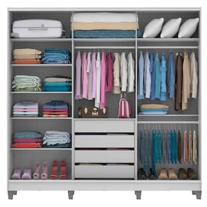 Internamente, conta com quatro gavetas espaçosas e resistentes, com corrediças metálicas. Os três tubos cabideiros em alumínio comportam qualquer tamanho de cabide. Ou seja, o espaço é perfeito para uma melhor organização de roupas, sapatos, acessórios, edredons e travesseiros.