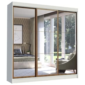 Itens inclusos: - Três (3) portas de correr com sistema anti-descarrilhamento, todas com espelhos - Dois (2) puxadores em alumínio com detalhes em PVC - Três (3) gavetas internas com corrediças metálicas - Dois (2) cabideiros em alumínio