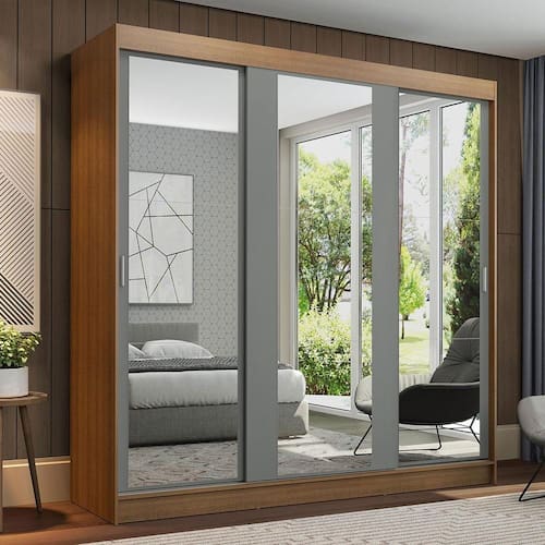São três portas de correr com trilhos em alumínio e deslizamento suave, que otimizam o espaço do quarto, sem atrapalhar no momento da abertura. Os espelhos dão um grande destaque ao móvel e ampliam o ambiente.