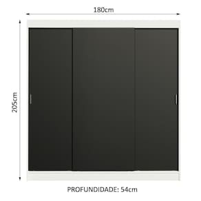 Medidas totais do guarda-roupa: 205 cm de altura x 180 cm de largura x 54 cm de profundidade.