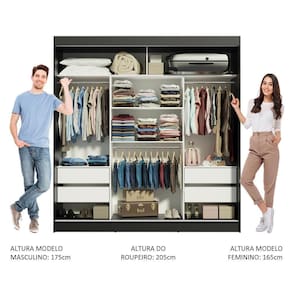 Medidas totais do guarda-roupa: 205 cm de altura x 180 cm de largura x 54 cm de profundidade.