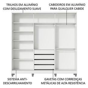 Conta com ótima interna, incluindo quatro gavetas espaçosas e com corrediças metálicas. Ideal para utilização no quarto de casal, o móvel possui abertura com três portas de correr com deslizamento suave, que facilitam a circulação no ambiente.