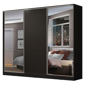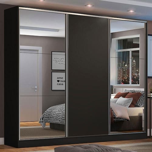 - Três (3) portas de correr com sistema anti-descarrilhamento, sendo duas (2) com espelhos e uma (1) de madeira