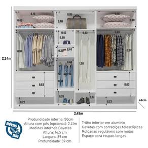 Medidas:Altura: 2,34 m (sem pés) e 2,41 m (com pés) / Largura: 2,45 m / Profundidade Externa: 60 cm / Profundidade Interna útil: 50 cm