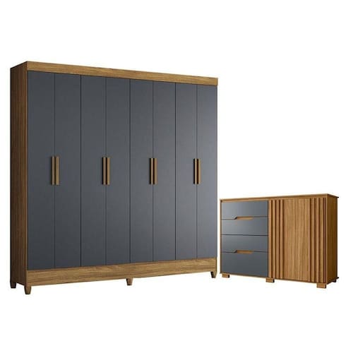 Organize seu quarto com elegância e o melhor custo benefício do mercado. Apresentamos o Guarda Roupa Casal Marajó e Cômoda Texas fabricados pela Moval. Guarda Roupa possui 08 portas, duas gavetas equipadas com corrediças metálicas sendo as duas internas, puxadores em MDF, cabideiros em alumínio para melhor organização interna e pés em PVC. A cômoda possui 04 gavetas com corrediças telescópicas, dobradiças 35mm com amortecedor, portas com detalhes ripados, puxadores usinados e pés em PVC. Fabricado com materiais de alta qualidade que garante resistência e durabilidade ao produto. Confira mais detalhes e aproveite!