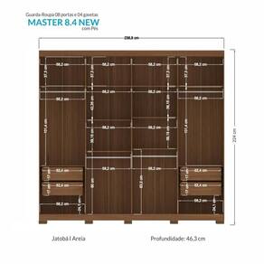 Guarda Roupa Casal Master New 8 Portas Jatobá/areia Com Pés - Santos Andirá Jatobá/areia Guarda Roupa Casal Master New 8 Portas com Pés - Santos Andirá O Guarda-Roupa Master Vip New é um espaçoso móvel para casal, projetado para oferecer amplo espaço interno. Ele possui uma divisão interna que atende às necessidades de ambos, com áreas designadas para Ele e para Ela. Com quatro grandes gavetas deslizantes, equipadas com corrediças telescópicas para um movimento suave, e dez prateleiras espaçosas para organizar roupas dobradas, acessórios, calçados e itens de decoração. Além disso, conta com quatro cabideiros/calceiros em alumínio para pendurar roupas de forma organizada. Seu design moderno inclui puxadores em MDF revestido, conferindo um toque charmoso e elegante. Este guarda-roupa é a escolha ideal para decorar o quarto do casal com praticidade e qualidade. ESPECIFICAÇÕES: - Estrutura em MDP - Pintura UV - 8 Portas - Dobradiças metálicas - Puxadores em MDF revestidos nas portas - 4 Gavetas internas - Corrediças telescópicas - 4 Cabideiros em alumínio - Espaço para sapatos - 10 Prateleiras - Maleiro - Amplo espaço interno - Pés em PVC