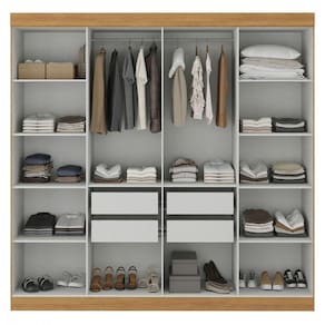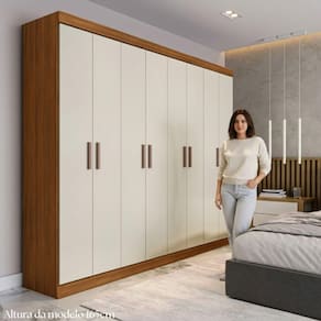 Conta com 8 portas bem distribuidas, proporcionando excelente aproveitamento interno para roupas longas, dobradas e acessorios. As gavetas com corredicas telescopicas garantem abertura suave e maior vida util, enquanto os varoes e calceiro em madeira agregam robustez e sofisticacao.