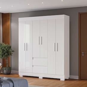 que tal o guarda-roupa maya? com o guarda-roupa maya você leva o aliado perfeito para seu dormitório completo e organizado. além de ter 6 portas e 2 gavetas para te ajudar na organização de itens do dia a dia, o móvel traz um visual sóbrio e atemporal, destacando a coloração elegante e os puxadores alongados em mdf. ah, notou que o espaço interno é na cor linho? um grande diferencial para dar aquele toque extra de charme ao seu quarto dos sonhos ;) Marca: Modern