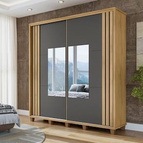 O Guarda-Roupa Casal Monte Carlo une design moderno e excelente aproveitamento interno. Conta com 2 portas de correr com trilhos em alumínio, que garantem abertura suave e economia de espaço. O destaque fica para as ripas decorativas nas laterais, que trazem textura e sofisticação ao ambiente, e para os espelhos nas portas, que ampliam a sensação de espaço e oferecem mais praticidade no dia a dia. Internamente, possui maleiros, prateleiras, cabideiros em alumínio e 4 gavetas com corrediças telescópicas, ideais para organizar roupas, acessórios e calçados com facilidade. Produzido em MDP/MDF, é resistente, funcional e perfeito para compor quartos de casal com elegância.