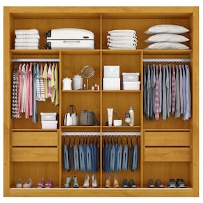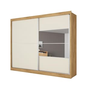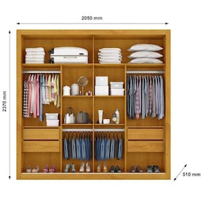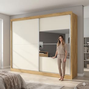 O design desse guarda-roupa da Móveis Europa é imponente e extremamente elegante. Ele contém duas portas de correr (com espelho em uma delas) e puxadores embutidos em alumínio, além de um espaço interno muito bem dividido, que dispõe de 2 maleiros amplos, 2 cabideiros, 2 calceiros, 4 gavetas, 4 nichos centrais e 2 compartimentos para sapatos.